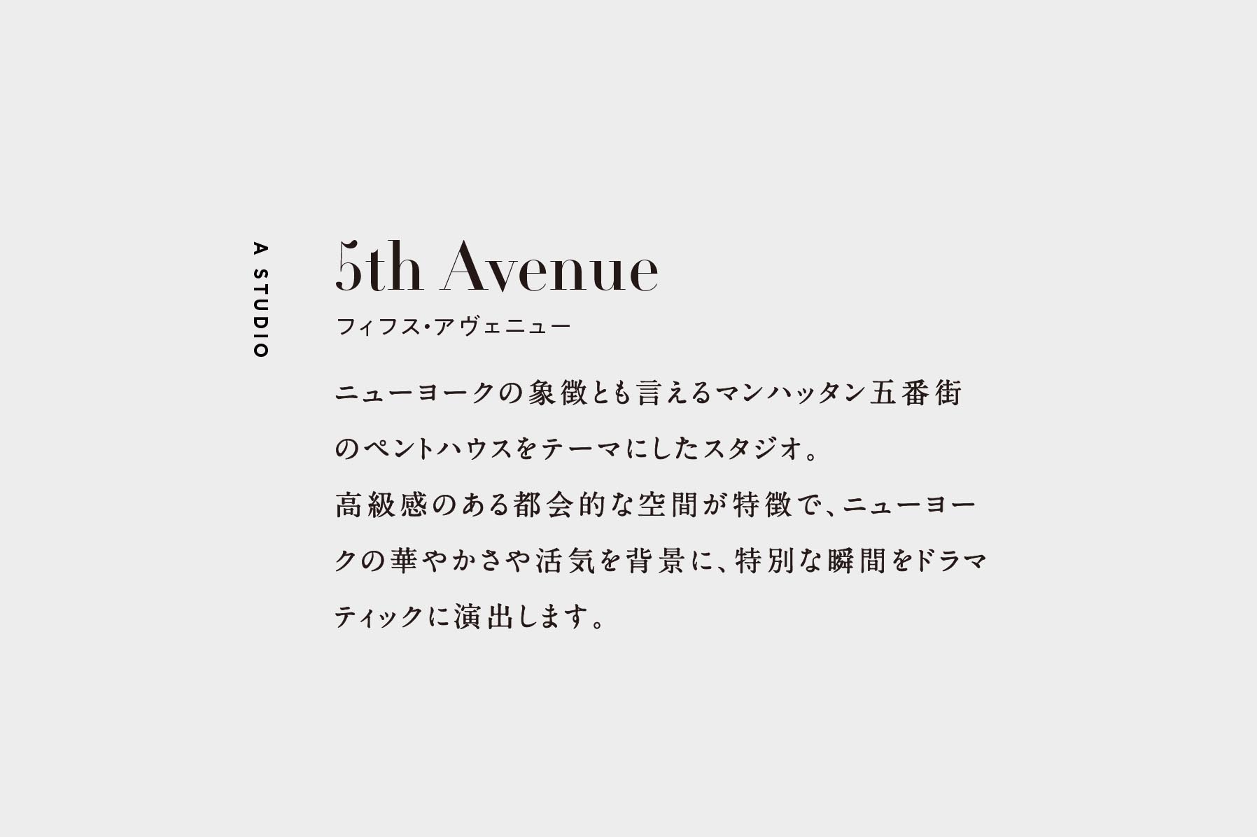 スタジオコンセプトは「6 brides of new york」ウェディングの流行発信地ニューヨークをイメージした空間とバリエーション豊富なセットで、ふたりだけのオリジナルなシーンが出来上がります。