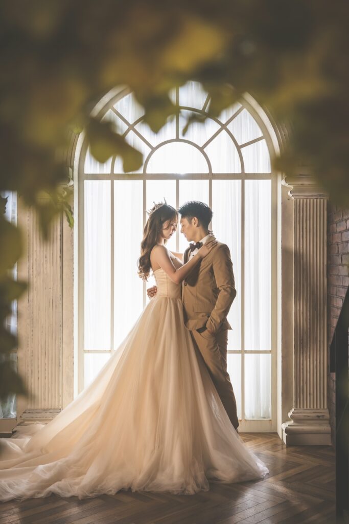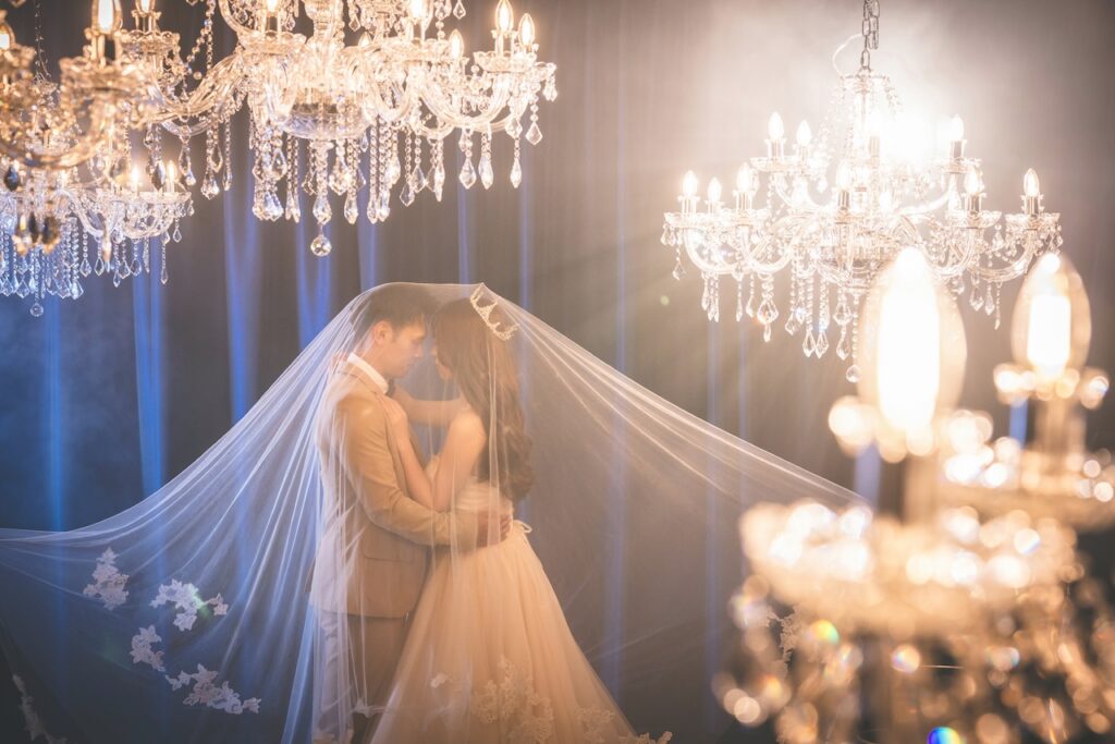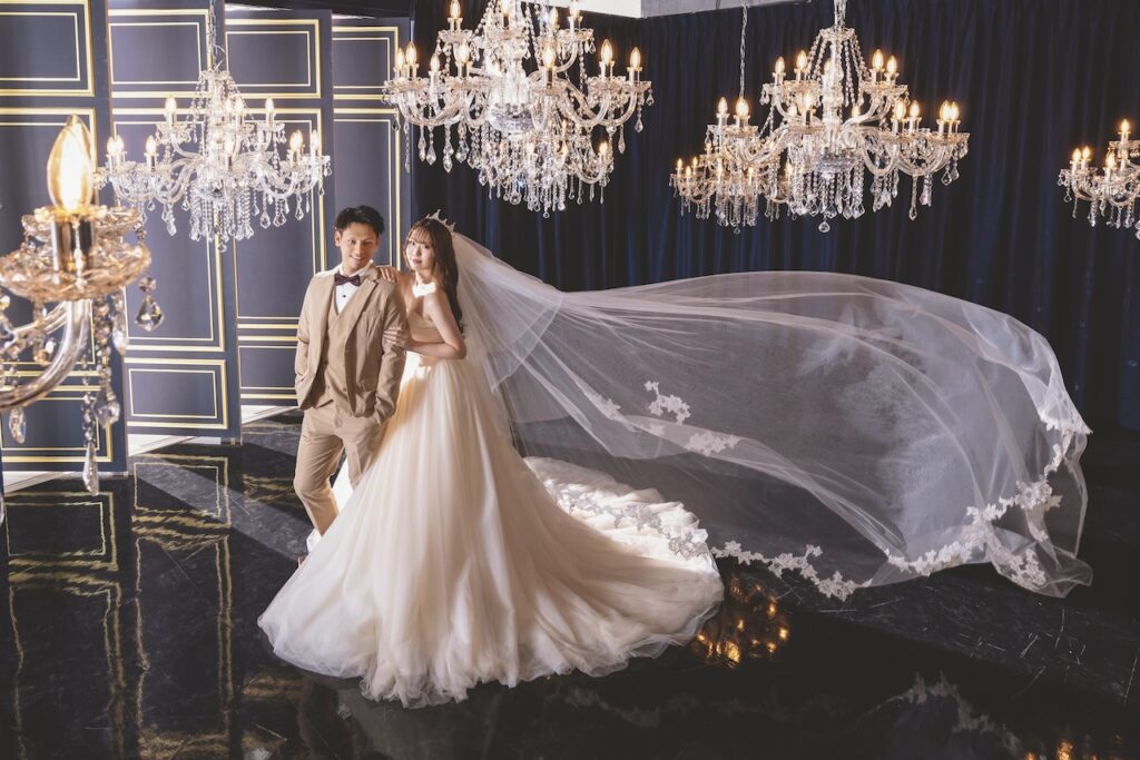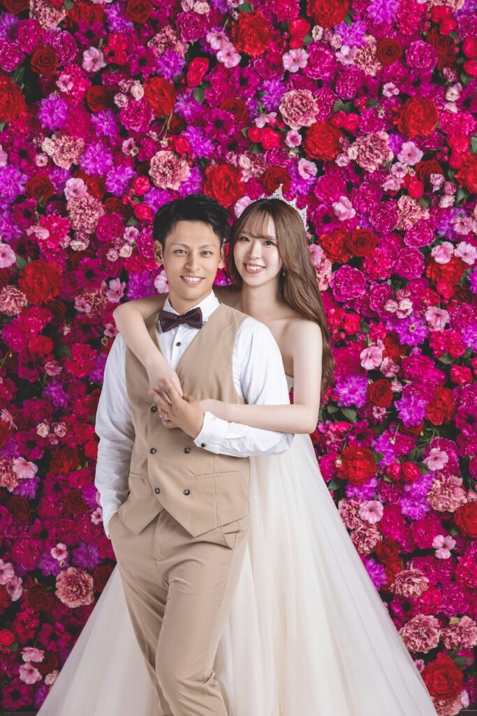 ウェディングドレス&ベージュのタキシードで華やかな雰囲気のふたり。