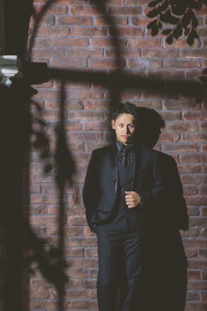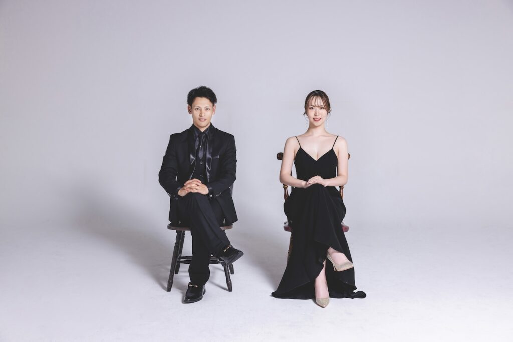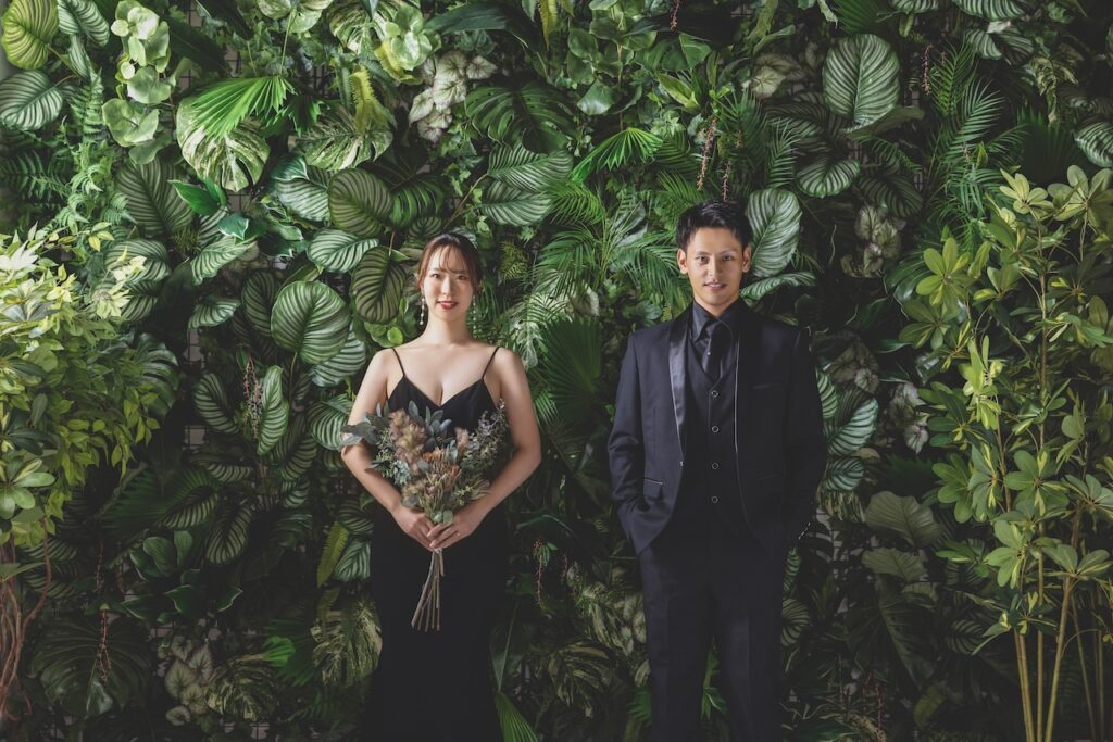 2着目は、ブラックで合わせたタイトドレス&タキシードのクールな印象。